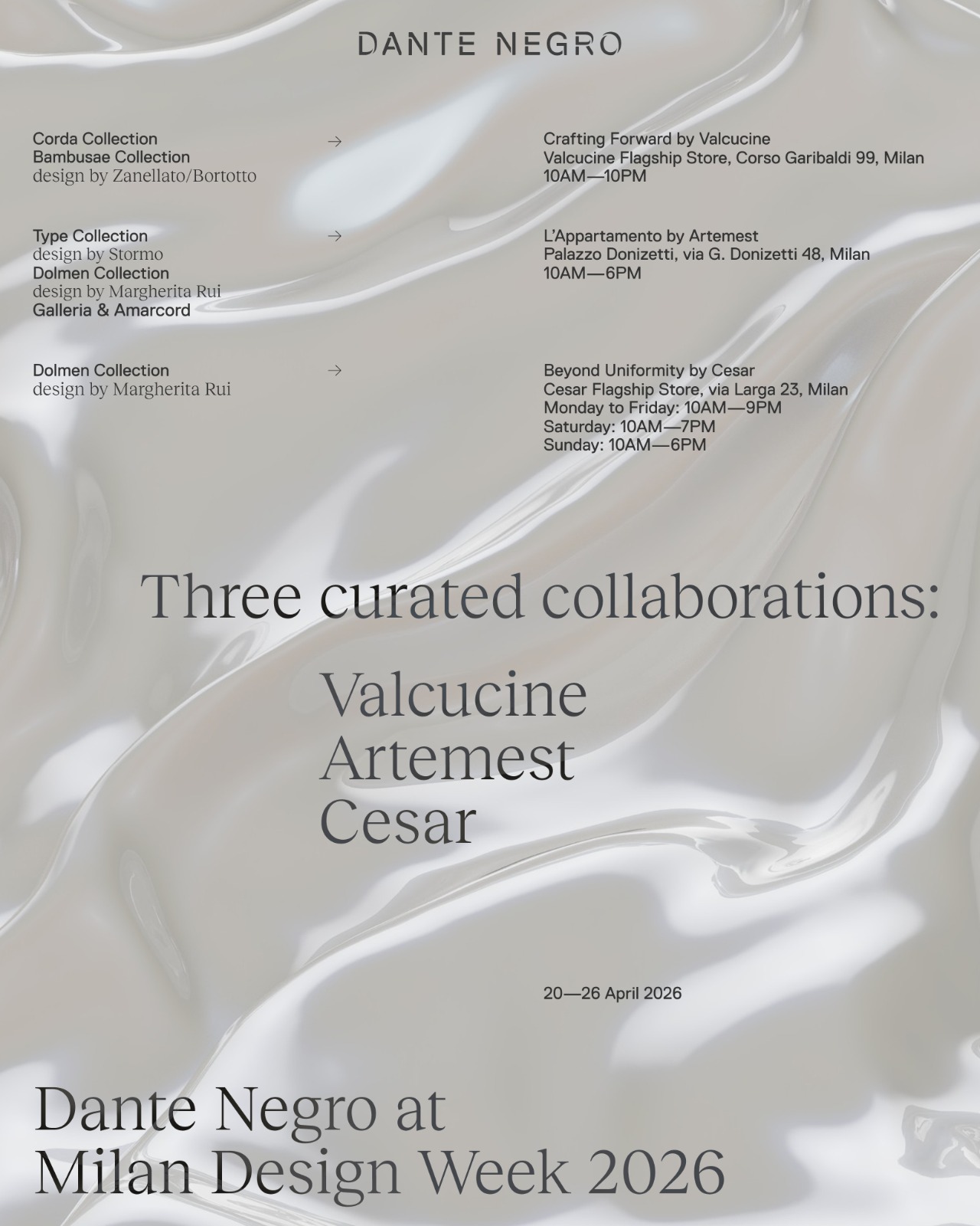 Para esta edición, Dante Negro es un socio destacado, que muestra el Dolmen colección diseñada por Margarita Rui — Un diálogo escultórico entre la artesanía, la investigación de materiales y la vida contemporánea. Las piezas se integran a la perfección en la narrativa de César, resaltando el potencial expresivo de la forma y la textura.